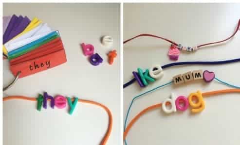 9. Thread letters together to form familiar words (e.g. sightwords, favorite words, spelling words, theme words or names of friends and family.